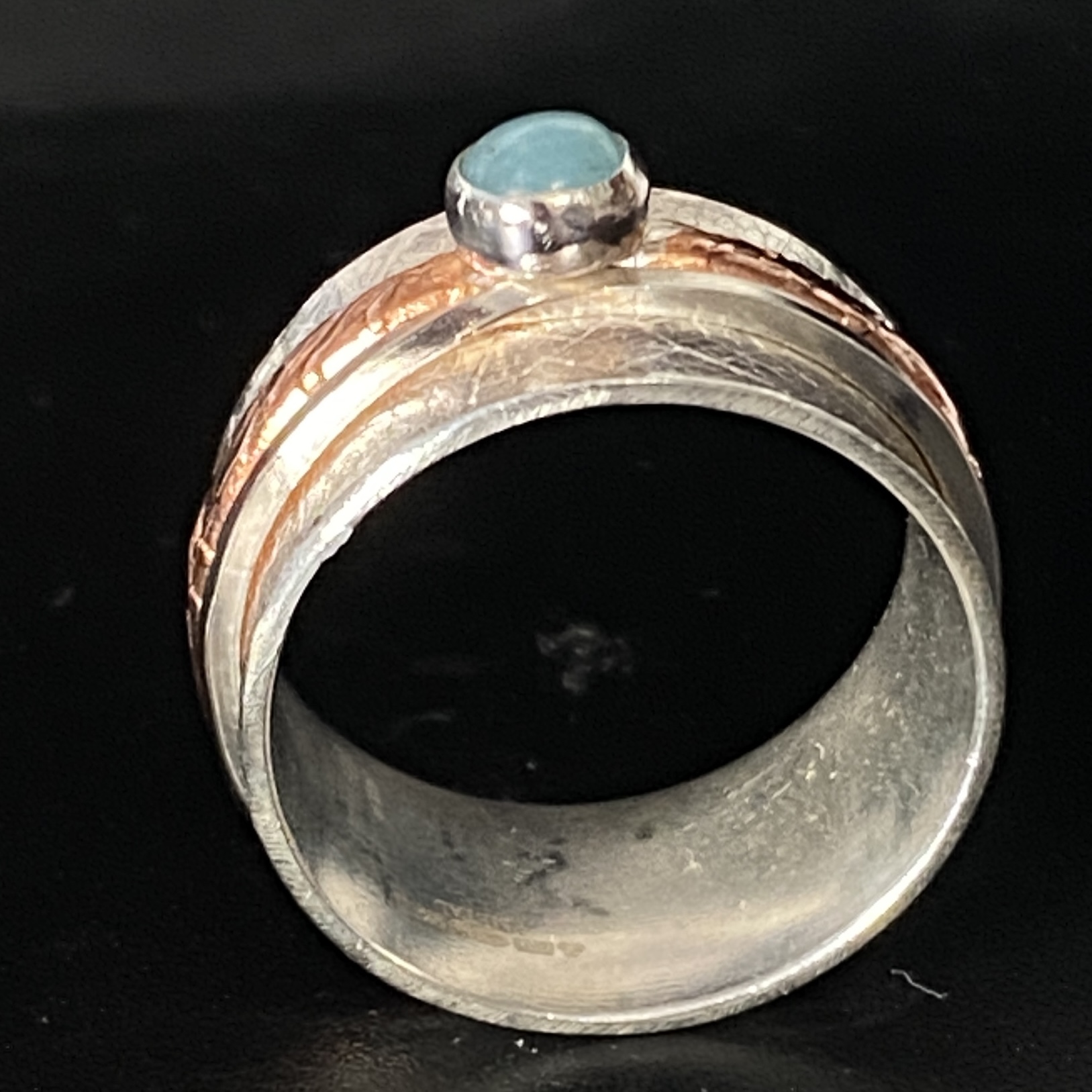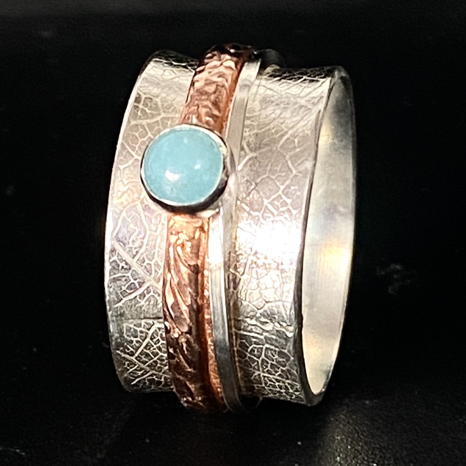 Sterling and copper Spinning Fiddle Ring set with Larimar (light Blue stone) Leaf imprinted background